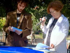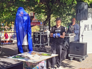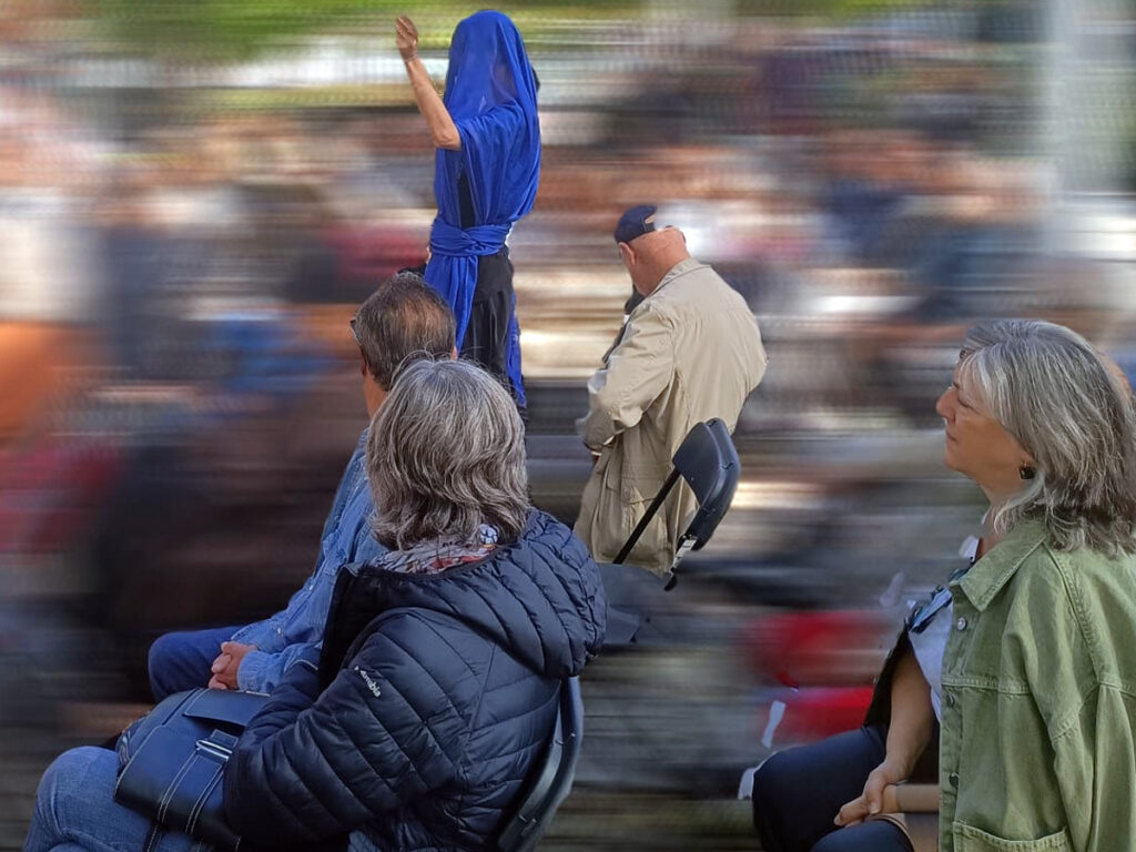 Una premisa que compartíamos: todo recital es un acto site-specific. No podemos ignorar el espacio en el que se recita. Todo espacio está cargado de memoria y de historia, todo espacio es político. El hecho de que la obra se desplegara en la calle fue fundamental. La calle es presente, lo que sucede se ve, pasa una paloma, un señor con el pan, pasa un cachalote. Todo está en presente y se observa en conjunto; conviven a la vez múltiples paisajes. Desde los ensayos compartimos el espacio con la escuela de baile del barrio, con los niños que nos interrumpían, con los ancianos dando pedales, con las bicicletas que atravesaban y arruinaban parte del atrezo.