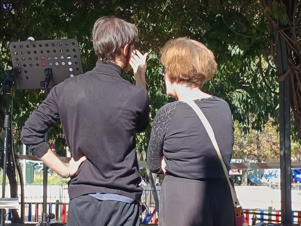 Elegimos unos textos para un barrio, pensamos en un público diverso, pensamos que en la calle hay distracciones, sabíamos cuándo se había construido la plaza y lo que se descubrió al inaugurarla: que en Carabanchel había muchos niños, pero estaban confinados en casa porque no tenían un lugar común donde jugar. En el proceso a tientas hubo que modificar los textos, entender sus ritmos, trabajar con un espacio sonoro. Recordamos mucho a Tadeusz Kantor: ante problemas técnicos soluciones poéticas.