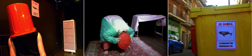Estas preguntas, que podría parecer las primeras, en realidad fueron las últimas que nos hicimos. La pieza es una búsqueda poética en un entorno conocido como Carabanchel, la búsqueda de la poesía como mecanismo para mostrar el barrio, y a nosotros mismos. Si la rutina fuera un cachalote, resulta que estamos tan inmersos en la rutina que no somos capaces de verla; el ojo del cetáceo nos resulta invisible, o lo que es lo mismo, no somos capaces de vernos a nosotros mismos. Pero también la pieza es una manera de devolver a los demás nuestro juego y nuestra investigación, y una de esas maneras fue el contacto con la realidad de las personas que se nos acercaban durante el trabajo. La pieza es también compartir el pan y la comida dominical después de ensayar con un gato revoltoso, la pieza es tender un puente a aquello que abre el diálogo. Todo esto se puede decir con palabras más grandilocuentes: nuestros deseos infinitos y nunca totalmente confesados fueron arañar un pedazo de verdad a la vida, acercar la belleza al barrio, poetizar la realidad de la calle, una realidad de cacas de perro y niños curiosos: ¿qué estáis haciendo?, ¿el teatro es como el cine?, ¿qué es un ensayo? Los niños, que habían abandonado momentáneamente los columpios, volvieron a sus juegos sin prestar mucha atención a nuestros intentos de respuesta erudita. Entonces, seguimos trabajando en la búsqueda de algo que aún no sabemos explicar muy bien. Suponemos que los que asistieron al acto descubrieron algo, aunque solo fuera la sorpresa de encontrarse con un cachalote azul una mañana de domingo de camino a comprar el pan, o antes de irse a comer con la familia.